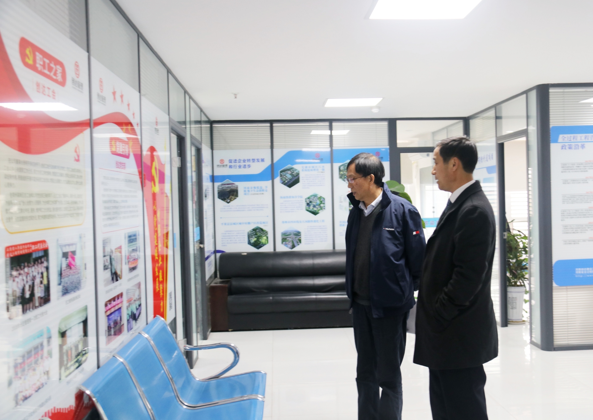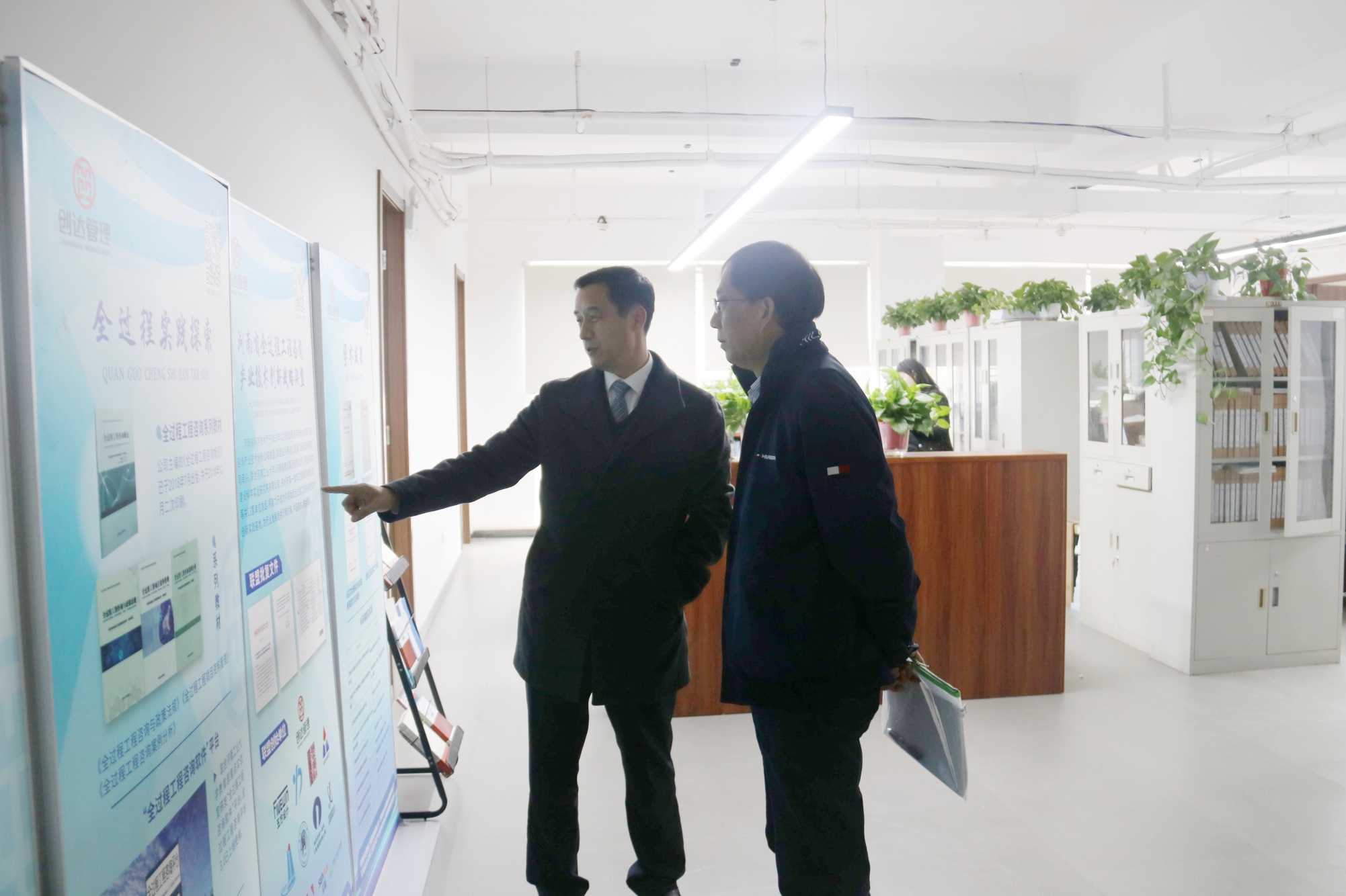 會(huì)前,董事長楊明宇帶領(lǐng)屠名瑚秘書長參觀了創(chuàng)達(dá)總部辦公環(huán)境。