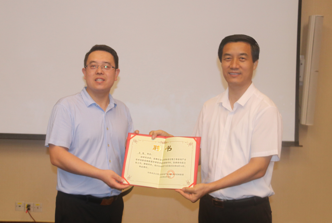 楊明宇理事長(zhǎng)為濟(jì)源技術(shù)研究院秘書(shū)長(zhǎng)王偉頒發(fā)聘書(shū)