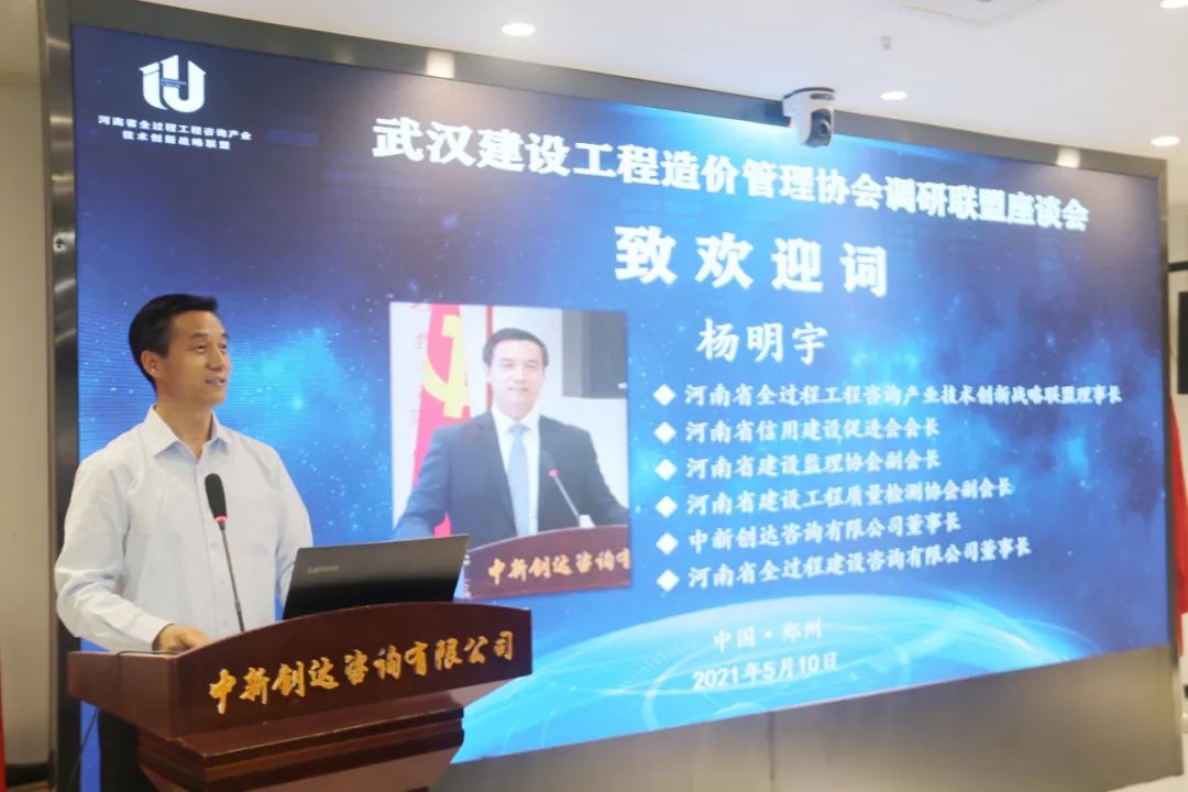 2021年5月10日下午,武漢建設(shè)工程造價(jià)協(xié)會(huì)顧問(wèn)、湖北省造價(jià)協(xié)會(huì)副會(huì)長(zhǎng)汪國(guó)剛,湖北省造價(jià)協(xié)會(huì)副會(huì)長(zhǎng)、中德華建(北京)國(guó)際工程技術(shù)有限公司董事長(zhǎng)汪建新,海天咨詢(xún)董事長(zhǎng)韓江濤一行9人到聯(lián)盟調(diào)研交流。河南省全過(guò)程工程咨詢(xún)產(chǎn)業(yè)技術(shù)創(chuàng)新戰(zhàn)略聯(lián)盟理事長(zhǎng)、中新創(chuàng)達(dá)咨詢(xún)有限公司董事長(zhǎng)楊明字、中新創(chuàng)達(dá)咨詢(xún)有限公司執(zhí)行董事徐希萍、黨支部書(shū)記董高峰、河南省全過(guò)程工程咨詢(xún)產(chǎn)業(yè)技術(shù)創(chuàng)新戰(zhàn)略聯(lián)盟秘書(shū)長(zhǎng)王偉及聯(lián)盟單位代表熱情接待并組織座談會(huì)。